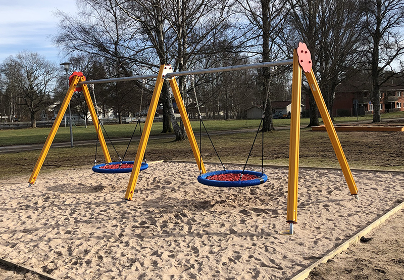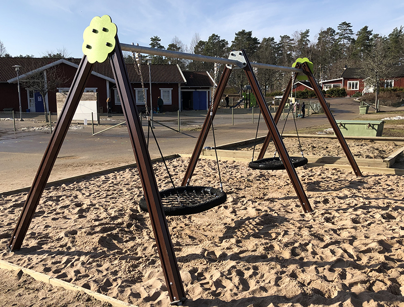 Gungställning med sidostolpar i aluminium och överliggare i varmgalvaniserat stål - för längsta hållbarhet! Sitsar och gungleder beställs separat.