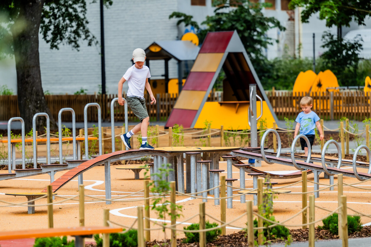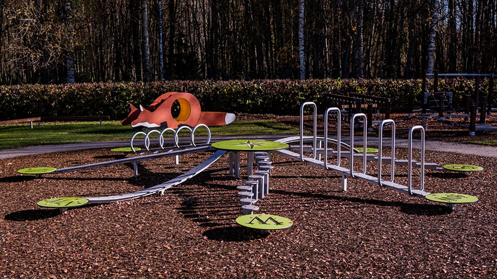 Det finns totalt 8 olika banor där barnen utmanas i balans och olika hinder, samt moment att krypa i.