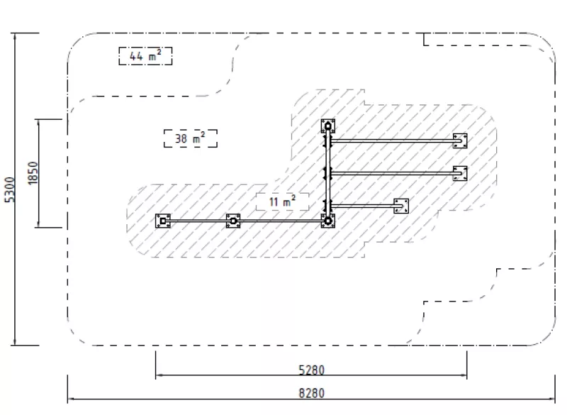 Produkten består av: parallella stänger, en trapets, en vertikal stege. Konstruktionen av enheten är gjord av vertikala stålprofiler som mäter 80 x 80 mm med en godstjocklek på 5 mm, och träningsanordningarna är fästa på den med en bultkoppling. Material: Rostfritt stål som standard. Pulverlackerad metall; varmförzinkad och pulverlackerad på begäran. Utrustningen fästs i marken genom gjutning och en ankarbultsanslutning finns som speciallösning. Setet är TÜV-certifierat enligt standarden EN 16630.