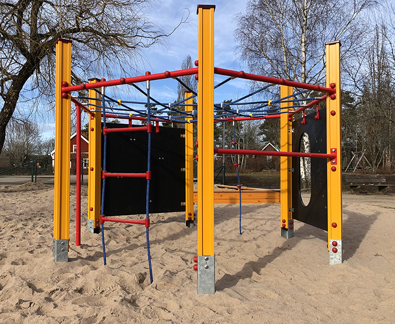 Den klassiska klätterställningen som utmanar barnen på flera olika sätt via klättring, nät, och klätterväggar.