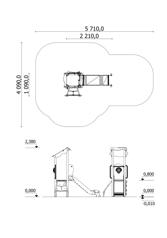 En stilig lekställning som utmanar två olika sätt för barnen att ta sig upp. Ett tak som skyddar, ett fönster att spana ut i och en rutsch för nedgång.