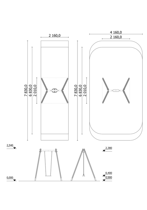 Gungställning med plats för 1 st. valfri sits. Stolpar i Skandinavisk furu behandlade med giftfri OrganoWood samt överliggare i rostfritt ädelstål.