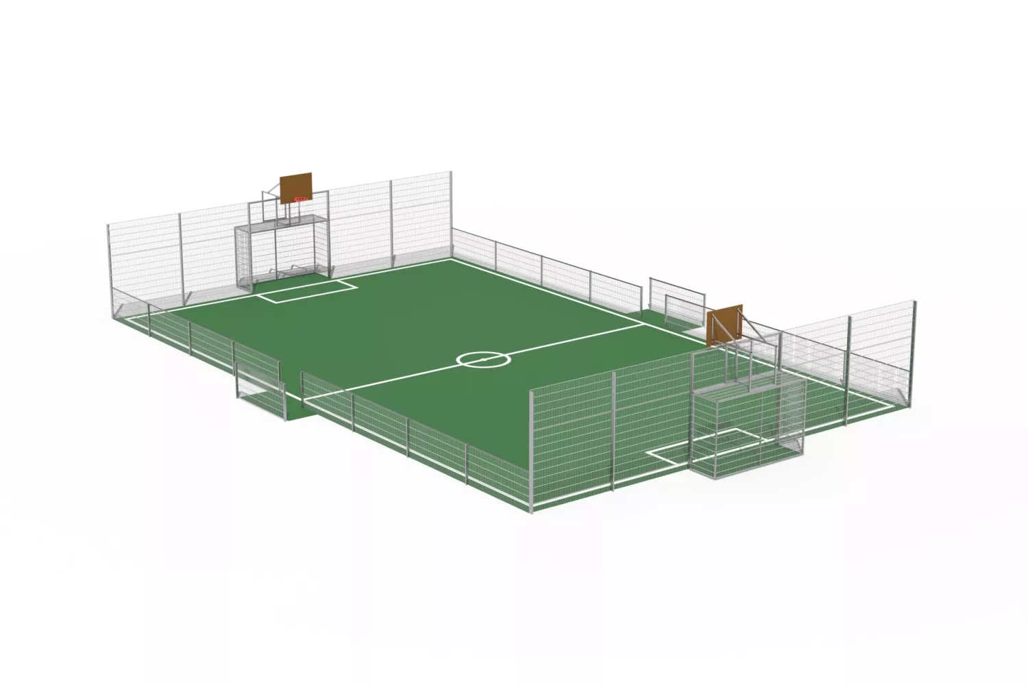 Arenan som inkluderar 2 st. 3x2 m fotbollsmål och 2 st. basketkorgar med tavlor finns också att beställa färgsatt i valfri RAL-kod.